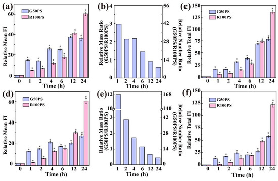 Cellular uptake of PS NPs after cells were exposed to PS NPs (20 μg/mL) for different times. The uptake is represented as the relative content of PS NPs in cells (a,d), the relative mass (left y-axis)/number (right y-axis) ratio (G50PS/R100PS) of PS NPs in cells (b,e), and the relative total content of intracellular PS NPs calculated by multiplying relative mean FI with cell number (c,f). (a–c) A549 cells. (d–f) BEAS-2B cells. The content of R100PS in BEAS-2B cells incubated with 20 μg/mL R100PS for 1 h was set as 1 (a,d). * p < 0.05 compared with the control (n = 3).