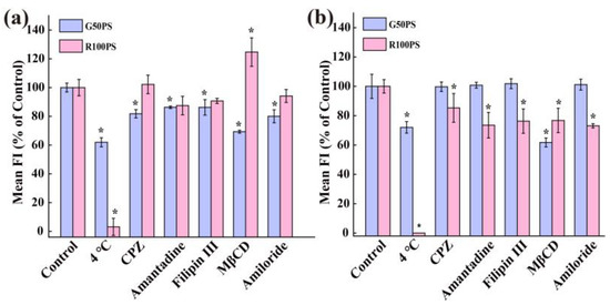 Firstly, we investigated whether the internalization of the PS NPs was an energy-dependent process or not. As shown in Figure 4, the uptake of G50PS by the cells was partly inhibited at 4 °C, and that of R100PS was almost completely inhibited at 4 °C, indicating that the uptake of R100PS required more energy than that of G50PS [52]. The energy-independent internalization of 50 nm NPs has been reported [53,54], and such internalization is possibly due to the partition of PS NPs in the water-phospholipid system [53].