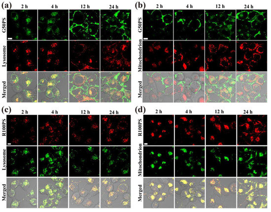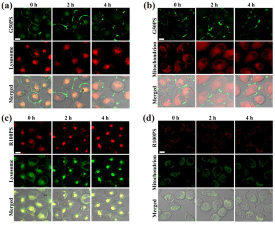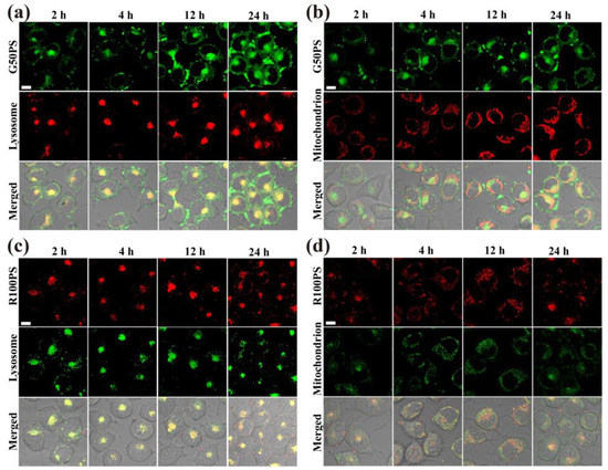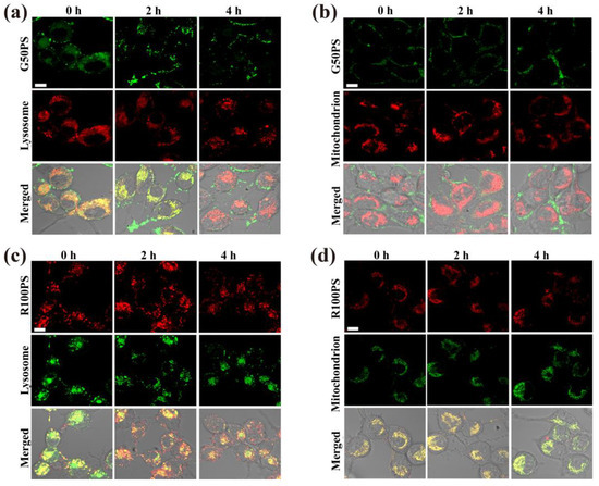 CLSM images of the subcellular location of PS NPs (20 μg/mL) in A549 cells after exposure to G50PS (green color) or R100PS (red color) for different times. Lysosomes and mitochondria are labeled red (a,b) or green (c,d). The scales represent 10 μm.