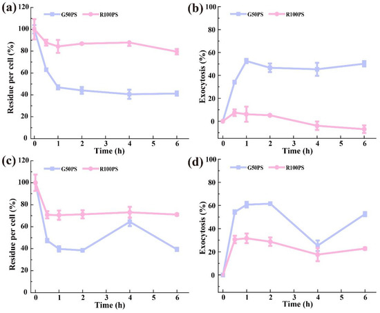 Furthermore, using CLSM, we observed that some G50PS in A549 cells left the lysosomes at 4 h (Figure 9a). However, no changes were observed in mitochondria (Figure 9b), possibly because of the low content of G50PS in mitochondria. The content of R100PS in both lysosomes and mitochondria did not change significantly (Figure 9c,d). Different from A549 cells, a significant decrease in G50PS in BEAS-2B cells over time was observed (Figure 10a), while there was no increased accumulation in mitochondria over time (Figure 10b), suggesting the exocytosis of G50PS via the lysosome pathway. As for R100PS, its contents in both lysosomes and mitochondria decreased, suggesting their translocation in cells and possible weak exocytosis (Figure 10c,d).