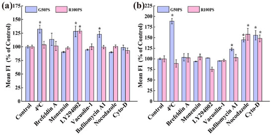 The excretion pathways of PS NPs from cells were investigated by incubating the cells for 2 h in the presence of different exocytosis inhibitors at 37 °C following the procedure reported previously [35]. In short, cells were pre-incubated with the culture medium containing 20 μg/mL PS NPs for 4 h. Then, the cells were washed with the D-Hanks solution three times and cultured in fresh culture medium at 4 °C or 37 °C for 2 h, or in the culture medium containing an exocytosis inhibitor for 2 h. The inhibitors were Brefeldin A (89 mM) (Beyotime Biotechnology Co., Ltd., Shanghai, China), Monensin (48 mM) (Beyotime Biotechnology Co., Ltd., Shanghai, China), LY294002 (1 mM) (Beyotime Biotechnology Co., Ltd., Shanghai, China), Vacuolin-1 (5 μM) (Selleck Chemicals LLC, Houston, TX, USA), Bafilomycin A1 (100 nM) (Abcam Plc, Cambridge Science Park, UK), CytoD (5 μM) (Shanghai Aladdin Biochemical Technology Co., Ltd., Shanghai, China), Nocodazole (15 μM) (Shanghai Aladdin Biochemical Technology Co., Ltd., Shanghai, China), and Filipin III (15 μM) (APExBIO Technology LLC, Houston, TX, USA) [39,41,42]. Afterward, the intracellular contents of PS NPs in the cells were detected by flow cytometry, as described above.