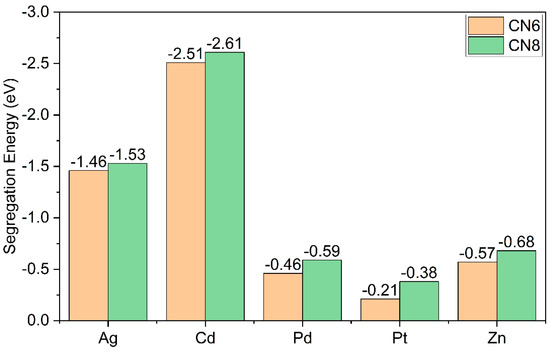 The segregation energy of the metal dopants Ag, Cd, Pd, Pt, and Zn in Cu54M clusters. Dopant metal located at two different coordination sites: CN6 and CN8.