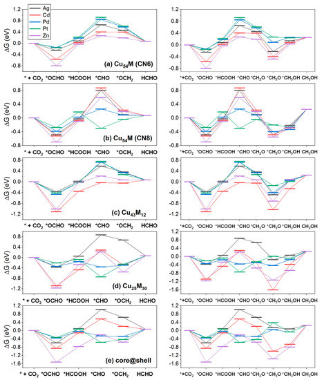 The Gibbs free energy diagram for the eCO2RR pathways to HCHO (left) and CH3OH (right) on the CuM clusters (M = Ag, Cd, Pd, Pt and Zn): (a) Cu54M with CN6, (b) Cu54M with CN8, (c) Cu43M12, (d) Cu25M30 and (e) core@shell.