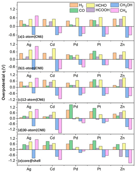 The overpotentials (η) for the electrocatalytic formation of H2, CO, HCOOH, CH2O, CH3OH and CH4 on the CuM clusters (M = Ag, Cd, Pd, Pt and Zn): (a) Cu54M with CN6, (b) Cu54M with CN8, (c) Cu43M12, (d) Cu25M30 and (e) core@shell.