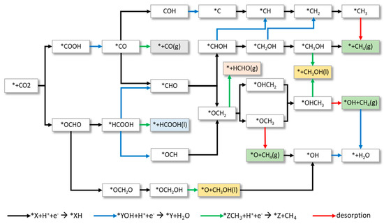 - *COOH → *CO → *CHO → *OCH2→ *OCH3 → *OHCH3;