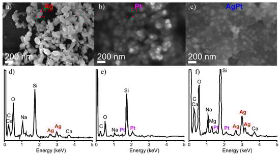 The data presented here confirmed the formation of NPs on PANI (Figure 2a–c). The brighter areas in the SEM images are associated with metal NPs and the darker areas are associated with the polymer. In case of LID with the C7H5AgO2 solution, NPs with sizes of up to 100 nm could be observed (Figure 2a). EDX analysis confirmed the formation of silver NPs (Figure 2d). In the case of deposition with the Pt(NH3)4(OH)2 solution, one can observe smaller NPs (30–50 nm) with a high degree of agglomeration. The diffusivity of the SEM image may be associated with the high agglomeration of metal NPs on the PANI film (Figure 2b). The EDX analysis confirmed that in this case, Pt NPs were deposited (Figure 2e). In contrast, for deposition with a mixed solution of silver and platinum precursors, the obtained NPs (~40 nm) were uniformly distributed on the PANI matrix; EDX confirmed the presence of both metals (Figure 2c,f). Our previous results on the deposition of multi-metallic nanoparticles by LID revealed the formation of structures representing monometallic crystallites and areas of alloys of the respective metals []; this allowed us to assume the formation of similar AgPt structures.