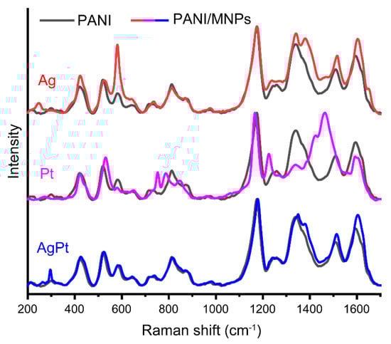 Changes in the Raman spectra of PANI as a part of the nanocomposites in comparison with pure PANI were observed. It is interesting to note that the PANI/AgPt sample had a minimal difference from the structure of pure PANI. The main difference can be found in the spectral region at about 1300–1500 cm−1.