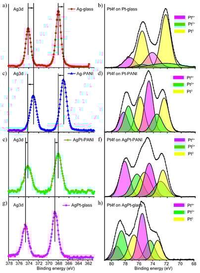 Left: XPS data for silver; right: XPS data for Pt. (a,b) Monometallic NPs on glass; (c,d) monometallic NPs on PANI; (e,f) bimetallic NPs on PANI; (g,h) bimetallic NPs on glass.