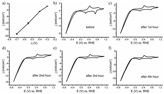 (a) Chronoamperometric data for PANI/AgPt at different overpotentials; (b–f) CV of PANI/AgPt samples recorded before and after each hour of chronoamperometry.