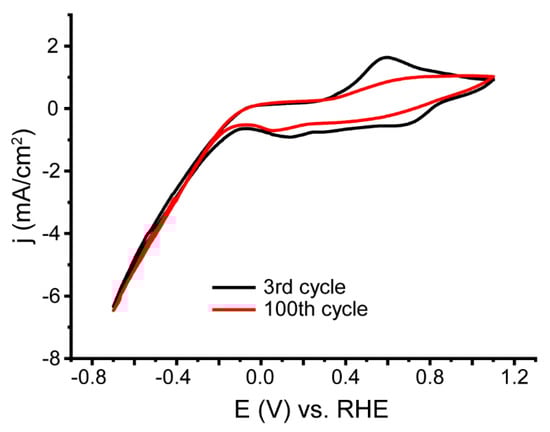 Additional stability measurements were carried out with continuous cycling. Figure 7 shows the CVs for Cycles 3 and 100 of the PANI/AgPt sample.