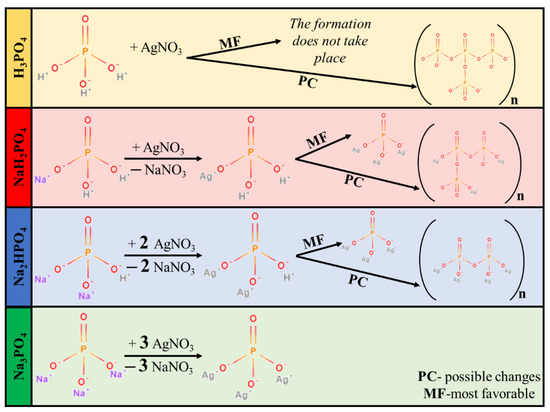 When NaH2PO4 was used as the phosphate source, the formation of Ag3PO4 was incomplete, while the formation of Ag4P2O7 was detected (Figure 1). The reason for this could be that the formation of HNO3 was not favored. This could be because, during the synthesis, Na+ exchange is more favored than that of H+. This makes the free formation of NaNO3 favorable because the electropositivity of Na+ is higher than that of H+. Against the Ag3PO4_NaH2PO4 samples, the Ag4P2O7 was not detected using Na2HPO4 or Na3PO4 as a phosphate source.