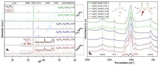 XRD patterns were recorded to elucidate the effect of the other three phosphate sources on the formation of Ag3PO4 crystals. Cubic Ag3PO4 was identified (COD 00-101-0324) in all cases: the reflections of the Ag3PO4 were located at 2θ° ≈ 21.1°, ≈29.8°, ≈33.3°, ≈36.7°, ≈42.6°, ≈47.9°, ≈52.8°, ≈55.2°, and ≈57.3°, which were assigned to (110), (200), (210), (211), (220), (310), (222), (320), and (321) crystallographic planes (Figure 2a). Additional reflections were also observed in the Ag3PO4_NaH2PO4 sample series located at 2θ° ≈ 27.0°, ≈30.6° and ≈32.1° (Figure 2a), which could be associated with the typical reflections of Ag4P2O7 [20]. These observations are consistent with the presumed mechanism (Figure 1). It must be emphasized that the pyrophosphate formation is much higher for NaH2PO4 than for the other two samples. In this case, crystallized pyrophosphate was formed since the materials have higher proton concentrations, and the possibility of condensation is much higher than in other cases. Interestingly, diffraction peaks of other Ag species, such as Ag nanoparticles or AgxO particles, were not found in the XRD patterns (Figure 2a).