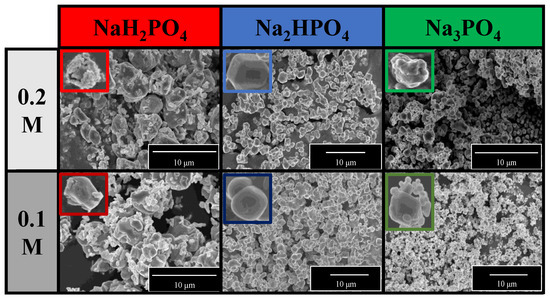 The morphological properties of the samples were analyzed using SEM. A correlation was found with the XRD measurements (Figure 2a). Two differently shaped and sized particles—spherical-like structure with 1.5 μm diameter and plates with 0.2 μm height—were obtained in the Ag3PO4_NaH2PO4 sample series (Figure 3). The particles could not be distinguished based on their elemental composition. This can be attributed to the co-presence of phosphate and pyrophosphate according to XRD patterns (Figure 2a). The samples prepared by using the other two phosphate sources had a much higher monodispersity (Figure S1) and a more defined shape (Figure 3). Their average particle size was ≈0.9 μm regardless of the used concentration. The particle size distribution was lower than for the Na3PO4 samples series; moreover, lower concentration resulted in smaller particles. The Ag3PO4_Na2HPO4 sample series contained more polyhedral particles compared to the Ag3PO4_Na3PO4 sample series.