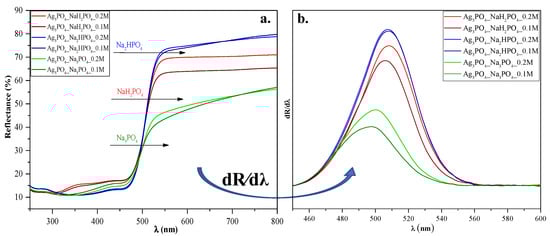 Diffuse reflectance spectroscopy was used to analyze the optical properties of the materials and to understand the light absorption properties of Ag3PO4_NaH2PO4 (which contained Ag4P2O7, a stand-alone photocatalyst [20]). As shown in Figure 4a, using different phosphate sources significantly influenced the visible light absorption properties of the samples, whose reflectance intensities decreased in the following order: