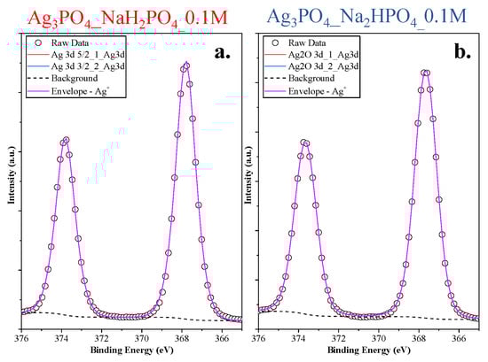 Ag3d XPS spectra of the Ag 3d (a) Ag3PO4_NaH2PO4_0.1M and (b) Ag3PO4_Na2HPO4_0.1M samples.