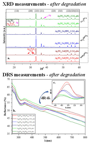 After the photocatalytic tests, we once again investigated the structural and optical parameters of the samples to examine the stability of the photocatalysts. After the photocatalytic activity, a slight modification was observed in the XRD patterns (Figure 7a) because not only the typical Ag3PO4 reflections (presented in Figure 2a), but a specific reflection of Ag (nano)particles was also observed at 38.1° (COD-00-110-0136). Based on our previous measurements [29,30], a silver-based material might lose photocatalytic activity due to the presence of Ag nanoparticles on the surface. Still, several publications in the literature state that Ag-based materials can be used quasi-unlimited times in (photo)catalytic processes [10]. Besides the deposited Ag nanoparticles, the typical reflection of Ag4P2O7 was also observed after the photocatalytic degradation, which was noticed before the degradation. Moreover, the optical parameters (Figure 7b–c) were also evaluated, and the decreasing intensity of the absorption band of Ag3PO4 was observed. The typical plasmon resonance band could not be clearly identified. Thus, it can be concluded that the amount of Ag nanoparticles was lower than the detection limit of the device applied. The appearance of AgxO is also possible because their reflection is close to that of Ag, and they do not have plasmon resonance bands in the reflectance spectra.