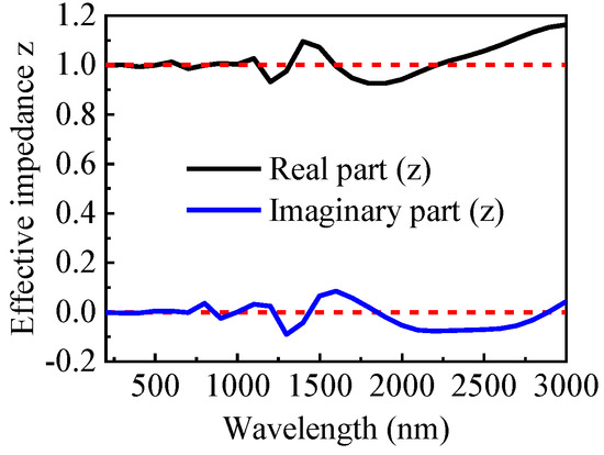 Evidently, near-unity absorption can be achieved, when the value of the effective impedance Z includes the real part (near 1) and the imaginary part (near zero). Figure 3 shows the calculated result from Equation (3), demonstrating the effective impedance Z matching that in the free space. Therefore, our metamaterial solar absorber has a better impedance-matching effect in the 200–3000 nm band, thus exhibiting a broadband perfect absorption.