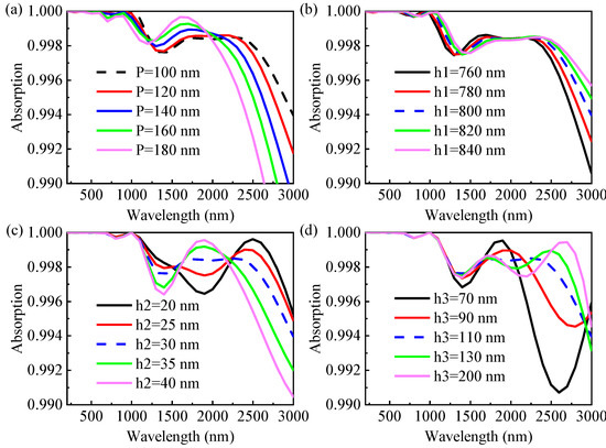 Subsequently, the height of the pyramid h1 also has a certain impact on the absorbing ability of the absorber. The absorption spectrum for the situation of an increasing height of the pyramid (h1) are shown in Figure 6b, where other parameters remain unchanged (P = 100 nm, h2 = 30 nm, and h3 = 110 nm). As the height of the pyramid is increased from 760 to 840 nm, slight spectral changes are observed in the short wavelength region (UV-VIS wavelength region), and long wavelength absorption changes become more obvious and undergo red-shift. In addition, the absorption decreases across the middle wavebands (1400–2000 nm) and increases across the short (1000–1400 nm) and long (2000–3000 nm) wavebands. Therefore, we take the middle height h1 = 800 nm as the optimum height of the pyramid.
