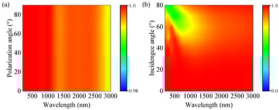 It is significant that the polarization and the incident angle hold insensitivity to maximize absorption of solar energy for a perfect solar absorber in practical applications. We conducted a numerical simulation about the absorbability of the designed solar absorber in this paper with different polarization and incident angles, and the results are depicted in Figure 7a,b, respectively. Figure 7a shows that the absorption spectrum remains unchanged when the polarization angle changes from 0° to 90°, with an average absorption rate of 99.84%. This insensitivity of the solar absorber to the polarization is due to the high degree of the symmetry of structure. Figure 7b presents the absorption band with the incident light angle adopting the data range from 0° to 80° at an interval of 10°, and the absorber has absorptivity values of 99.84%, 99.86%, 99.50%, 97.80%, 94.33%, 88.85%, 84.24%, 82.08%, and 87.86%, respectively. In addition, the perfect wideband absorption spectrum almost shows stability absorption from 0° to 40°. For incident angles less than 40°, the absorption bandwidth remains essentially constant. Figure 7b presents the absorber exhibits stability absorption for incident angles less than 40° and the absorption bandwidth is unchanged essentially within 200−3000 nm. By further increasing the incidence angle to 50°, the absorption intensity begins to decrease slightly in the short wavelength band (near 800 nm). Nevertheless, when the incident angle is 80°, the absorber can still own an 87.86% absorption efficiency. At oblique incidence, as the angle of incidence increases, the scattering and the reflection increase, which in turn leads to a decrease in the absorption performance of the absorber, but the magnitude and the extent of the absorption intensity reduction are relatively limited. The above properties prove that the absorber is capable of broadband absorption when the angle of incidence varies greatly and provides polarization-independent absorption at the normal incidence of light.