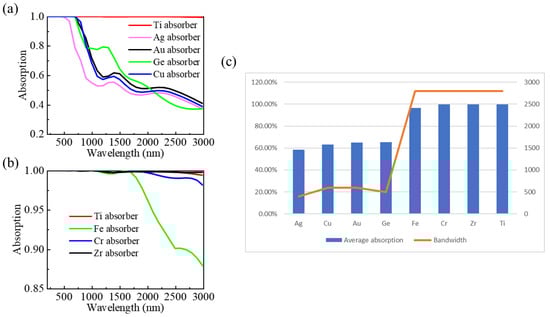 (a) Simulation results of different materials by keeping the SiO2 dielectric film unchanged and replacing Ti material with common metals Au, Ag, Cu, and Ge; (b) simulation results of different materials by keeping the SiO2 dielectric film unchanged and replacing the Ti material with refractory metals Zr, Cr, and Fe; (c) the average absorption efficiency and the broadband absorption of over 90%.