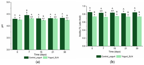 The pH and acidity are two important parameters that determine the quality, shelf-life stability and acceptance of yogurt products. Furthermore, pH is also important to access the safety of a food product (pH > 4.5 can allow the survival of some pathogens, such as salmonellae and Escherichia coli) [16]. The pH values and the titratable acidity, determined as the percentage of lactic acid, of control yogurt (i.e., plain yogurt) and yogurt with SLNs during the shelf-life (30 days) at 4 °C are presented in Figure 1a,b, respectively. The pH values ranged between 4.30 ± 0.005 and 4.34 ± 0.015 for control yogurt and 4.27 ± 0.023 and 4.25 ± 0.029 for yogurt with SLNs, during the 30 days of shelf-life, Figure 1a. In a standard plain yogurt, a pH of 4.2 is acceptable to most tastes [16]; therefore, the yogurt with SLNs could be accepted by most consumers in terms of its pH. Overall, the incorporation of SLNs into the yogurt slightly decreased the pH; however, both samples maintained the pH during shelf-life, showing that the SLNs did not impact the stability of the yogurt in terms of its pH. In relation to the titratable acidity, both control yogurt and yogurt with SLNs maintained the titratable acidity over the storage time, where yogurt with SLNs showed lower values than the control yogurt, 0.74% lactic acid and 0.84% lactic acid respectively (p < 0.05).. Other authors observed a decrease in pH and an increase in titratable acidity over time for both control yogurts and yogurts fortified with nanostructures due to the production of lactic acid from lactose by the starter culture bacteria [9,12,17]. However, these authors also produced the yogurt in the lab, while in this work a commercial product was used. In conclusion, the incorporation of SLNs into yogurt decreased slightly, but significantly, the pH and titratable acidity values, but these did not change significantly over time.