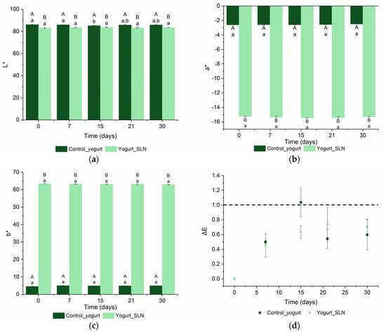 Color parameters: L* (a), a* (b), b* (c) and total color difference (ΔE) (d) of control yogurt (i.e., plain yogurt) and yogurt with SLNs during shelf-life. a–b Different lower-case letters indicate a statistically significant difference over time for the same sample (p < 0.05). A,B Different uppercase letters indicate a statistically significant difference between samples for the same time (p < 0.05).