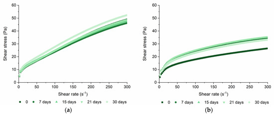 Flow curves of yogurt with SLNs (a) and control yogurt (i.e., plain yogurt) (b) during shelf-life.