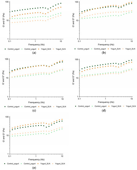 Frequency sweep of yogurt with SLNs and control yogurt (i.e., plain yogurt) at beginning (a), 7 days (b), 15 days (c), 21 days (d) and 30 days (e). Whereas