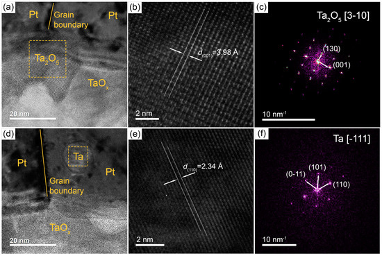 Cross-sectional high-resolution transmission electron microscopy (HRTEM) images of the Ta/Pt film annealed at 730 °C for 12 h (a,d) with zoomed images showing lattice structure of boxed area (b,e) and corresponding FFT patterns (c,f).
