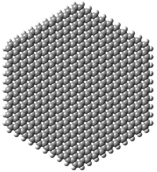 We studied a hexagonal graphene quantum dot with 10 carbon atoms on each edge and hydrogen passivated resulting in a molecular formula (see Figure 1). All edges were of the zig-zag type to avoid the appearance of other phenomena, such as asymmetric or unbalanced magnetic states [89,90] or significant repulsive interactions between passivating atoms. This system, with a distance between vertices of 46.4 Å, allowed us to achieve a compromise between the experimental size of graphene natural corrugation [39,41] and computational cost.