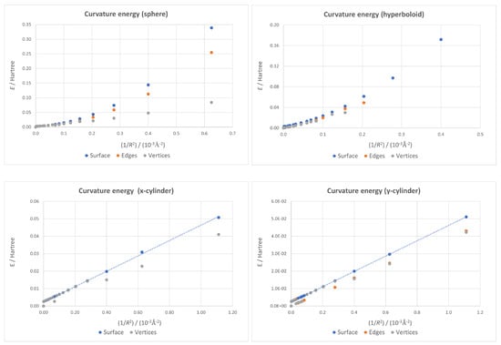 While the fixed-surface cylindrical plots are essentially straight lines, as the least-squares linear fits plotted in Figure 5 prove—showing the linear dependence on characteristic of the continuum model applied to a nanotube [92]—the spherical and hyperboloidal ones are not. In our previous work [70], it was shown how this discrepancy with the continuum model could be connected in the spherical case to the small position changes derived from the use of quantum mechanics in the optimization instead of a classical force field. However, these new results prove that the continuum model is indeed valid for the cylindrical cases—that are curved surfaces—even when quantum mechanics is used to determine geometries, suggesting there are other important contributions besides the theory used for geometry optimization. It seems that structures with non-zero Gaussian curvature suffer additional strain that the continuum model cannot take into account.