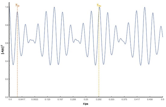 After substituting this expansion into Equation (4), the final temporal evolution shows several terms inside the exponential, each of them corresponding to one time scale and giving rise to different regeneration times (classical, ; revival, ; superrevival, ; …):