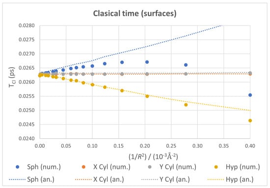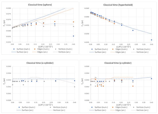 Classical time plots as functions of for all four ideal geometries, with numerical values as markers and analytical ones as dotted lines. Both cylinders show near perfect coincidence.