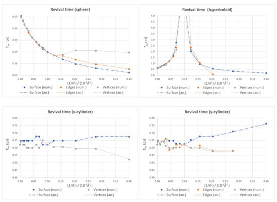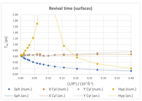 Once again, the plots corresponding to both cylindrical cases in Figure 10 can be used to make an accuracy estimation. The jumps for very low values of (below ) are an indication of the accuracy of our revival times: around 0.05 ps. It is therefore not clear if the change in tendency for large values of (i.e., high bendings) from slightly increasing to slightly decreasing in the two cylindrical cases is real or not.