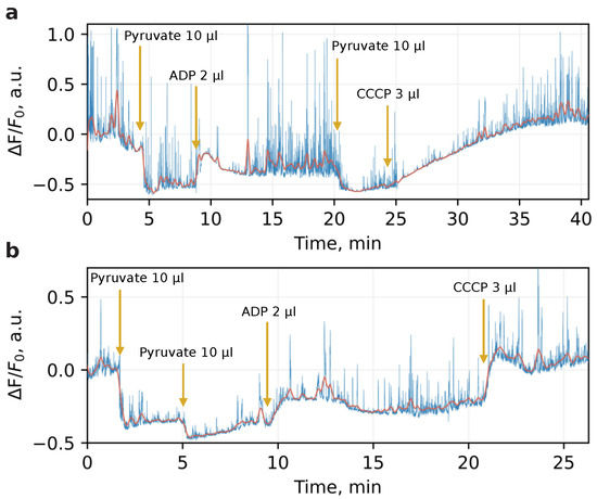 The mitochondrial functional assay was carried out in the phosphate medium at room temperature (23 °C). A 20 M fluorescent dye TMRM (Tetramethylrhodamine, Methyl Ester, Perchlorate, ThermoFisher, Waltham, MA, USA) was used as the mitochondrial membrane potential indicator (the emission peak at 582 nm); 2 mM pyruvate (Sigma Aldrich, St. Louis, MO, USA) was used as a respiration substrate, 100 M ADP (Sigma Aldrich, USA) was used to activate ATP production, 4 M mitochondrial oxidative phosphorylation uncoupler CCCP (2-[2-(3-Chlorophenyl) hydrazinylyidene] propanedinitrile, ThermoFisher, USA) was used to render mitochondrial inner membrane permeable to protons.