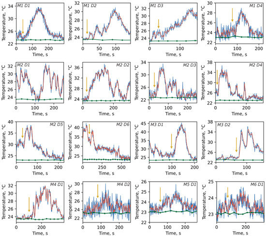 Figure 3 illustrates the temperature tracks recorded for different dishes within each of the six mice. The time step between DT indications was chosen to be 1 s to achieve the best signal-to-noise ratio while still considering the possible quick thermal dynamics. One can see that the temperature elevation ranges from several to tens degrees Celsius above the ambient level (green dots) primarily right after CCCP injection (yellow arrow). The maximum thermal burst within a single dish of °C is observed for M3D1. However, temperature bursts were also detected before CCCP application (e.g., M2D1, M2D6, M3D1). Such spontaneous thermal responses are not lower in amplitude than CCCP-stimulated ones and could be attributed to the mitochondria which may be currently involved in ATP synthesis or controlled potential leaking to avoid reactive oxygen species hyperproduction due to excessive potential value.
