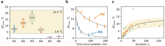 Ultimately, we delve into the kinetics of thermal responses for M1–M4 mice (Figure 4c). Each burst in temperature traces presented in Figure 3, either spontaneous or CCCP-stimulated, was carefully treated in order to evaluate temperature amplitude in accordance with its duration determined as full-width at half-maximum (FWHM). The set of points calculated for each mouse is shown in Figure 4c. The dependence clearly illustrates the saturation nature of thermal bursts and therefore was fitted (black curve) with , where is a temperature long-term limit, is the saturation duration. An approximation gives °C and s implying the principal amplitude of temperature bursts ceases to increase significantly at the duration of ~30 s. Apparently, this behavior implies that the resource of potential energy accumulated in mitochondria is limited and not enough to produce heat permanently.