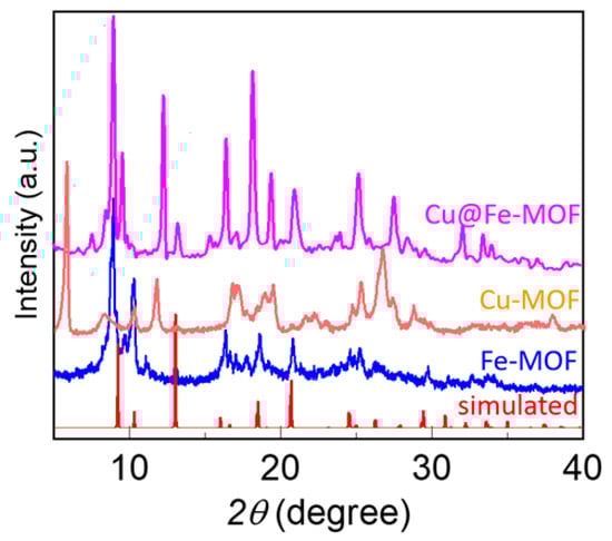 Due to the prominent XRD peak of the NF substrate, the thin layer of MOF film deposited on an NF substrate made it challenging to access the core MOF peak for analysis using thin film X-ray diffraction (XRD). Therefore, powder samples of the MOFs were compiled from the solvothermal procedure and analyzed, as presented in Figure 2. The XRD diffraction patterns of both MOFs were found to be closely matched with those of the NH2-MIL-88B(Fe2Ni) MOF, suggesting its crystallization in a P63/MMC space group belonging to the hexagonal crystal structure [47,56]. However, the XRD patterns of the Cu@Fe-MOF electrode shows additional peaks at about 12.4°, 19.5°, and 27.6°. To know the source of these peaks, we analyzed the Cu-MOF powder, which showed different XRD patterns than that of the Fe-MOF and Cu@Fe-MOF electrodes. This suggests that Cu coordinates with the ligand through a different pattern. In addition, the above three unknown peaks observed in the Cu@Fe-MOF patterns seem to come from the Cu-MOF. In addition, Figure S1a,b EDX analysis disclosed that the Cu@Fe-MOF/NF electrode included C, N, O, Fe, and Cu in atomic percentages of 70.30%, 6.34%, 15.23%, and 5.53%, and 2.60%, respectively.