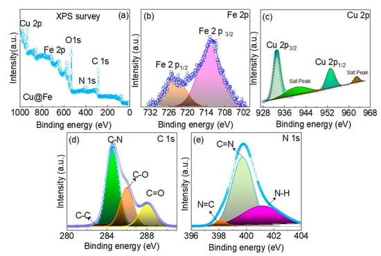 XPS was used to study the chemical and binding states of elements in Cu@Fe-MOF/NF. The XPS survey in Figure 4a reveals the existence of Cu, Fe, N, O, and C elements. Figure 4b illustrates the high-resolution Fe 2p spectrum centered at 713.57 and 725.01 eV, corresponding to the Fe 2p3/2 and Fe 2p1/2 orbitals, respectively. This result suggests that the Cu@Fe-MOF/NF electrode contains Fe centers in the 3+ oxidation state [56,57]. Similarly, the two prominent doublet centers at 953.28 eV and 933.21 eV observed in Figure 4c correspond to the Cu 2p1/2 and Cu 2p3/2 orbitals, respectively. A pair of accompanying satellite peaks at 943.71 eV and 962.93 eV was also observed [58]. Furthermore, the C 1s spectra in Figure 4d suggests that the C-N and the C=O bonds associated to the benzene ring of the organic ligand were present. Additionally, the N 1s spectra illustrated in Figure 4e showed the existence of C=N bonding. These results assumed that the amino-terephthalic acid ligand (C8H7NO4) is coordinated with the Cu and Fe ions to form bimetallic Cu@Fe-MOF.