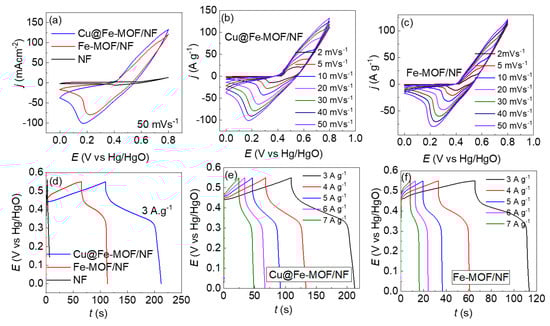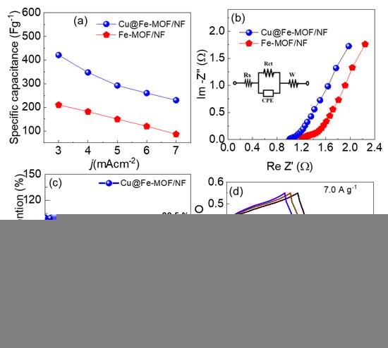 This suggests that the dual redox capacitive metal centers in the Cu@Fe-MOF/NF electrode can store more electrical charges. Figure 5b,c demonstrates that the Cu@Fe-MOF/NF electrode and Fe-MOF/NF electrodes deliver the higher electrochemical capacitance with rising the scan rate (2 to 50 mVs−1). Note that the shapes of the voltammograms in all the potential scanning rates are similar, suggesting the electrochemical reversibility of the electrode materials. Furthermore, the GCD characteristics of the MOF film-based electrodes were conducted under a constant current density of 3, 4, 5, 6, and 7 A g−1 in a potential window range from 0 to 0.55 V vs. reference electrode Hg/HgO (Figure 5d–f). Unlike the symmetric triangular curve in the case of the electric double-layer capacitor (EDLC), the obtained GCD curves of this work shows a non-linear shape, which is the battery-like characteristics, revealing the pseudocapacitive faradaic reaction [59]. This finding is also in line with the CV results. The longer discharge durations of the Cu@Fe-MOF/NF electrode materials show that the capacitance of the Cu@Fe-MOF/NF materials was significantly improved after introducing the Cu-metallic centers to the pristine Fe-MOF/NF. The specific capacitances of the Cu@Fe-MOF/NF and Fe-MOF electrode materials were determined using their GCD curves using the Equation (1), and the results are shown in Figure 6a. The estimated specific capacitance for the Cu@Fe-MOF/NF electrode at a low current density of 3 A g−1 is found to be 420 F g−1, comparatively higher than that of the Fe-MOF/NF electrode (210 F g−1). While the specific capacitances of the Cu@Fe-MOF/NF samples were 347, 292, 260, and 230F g−1 at various current densities of 4, 5, 6, and 7 A g−1, the Fe-MOF/NF sample showed the lower specific capacitance of 182, 150, 120, and 87 F g−1, correspondingly. The superior electrochemical performance of the Cu@Fe-MOF/NF electrode is accredited to the collaborative coordination of the copper (Cu) and iron (Fe) metal ions with the organic ligand, which provides a favorable environment for supercapacitor applications. In addition, the distinct bipyramidal structures making a large number of interfacial regions with the nanoparticles in the Cu@Fe-MOF/NF electrode were favorable for offering the larger active specific surface areas, which ultimately delivered a high charge–discharge rate.