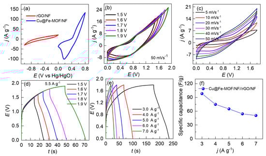Selecting a suitable potential window is critical for the asymmetric solid-state supercapacitor (ASSSC) device. Therefore, first a Cu@Fe-MOF/NF cathode and an rGO/NF anode were utilized to construct an ASSSC device in 1.0 M KOH aqueous electrolyte. Figure 7a displays the CV plots of the Cu@Fe-MOF/NF and rGO/NF electrodes in a three-electrode assembly at a scan rate speed of 50 mV s−1. The rGO/NF electrode functioned between 0 to −1 V, while the Cu@Fe-MOF/NF electrode film was operated with a potential window in the range of 0 to + 0.8 V. The utilization of two distinct electrodes in the ASSSC device with a well-balanced combination can enable a wider range of operating potential, enhancing its overall performance. Further, an ASSSC device has been developed to prevent internal shortening caused by electrolyte leakage, and the device assembled using a Cu@Fe-MOF/NF cathode and a rGO/NF anode sandwiched in a polymer gel electrolyte (Cu@Fe-MOFǁPVA-KOHǁrGO). To define an optimized potential window, the device was cycled at a scan rate of 50 mV s−1 while the potential window was gradually changed from 0.0~+1.5 to 0.0~+1.9. The process and results of this optimization are illustrated in Figure 7b. The region under the CV curve spectrum is improved with rising the potentials, as witnessed in Figure 7b. The as-assembled ASSSC device displays good capacitive characteristics by maintaining a quasi-rectangular CV spectrum under the potential window up to +1.8 V.