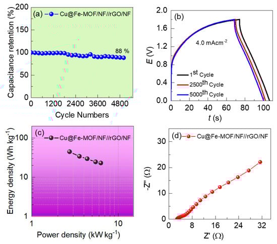 In addition, Figure 7c depicts the complete CV curves of the Cu@Fe-MOFǁPVA-KOHǁrGO device acquired at different sweep speeds varying from 5 to 50 mV s−1. All CV curves spectrum in Figure 7c maintain their shapes at different scan speeds, suggesting better capacitive properties of the device. The shape of the CV plots was maintained when the scan speed increased, confirming the outstanding electrochemical reversibility of the Cu@Fe-MOFǁPVA-KOHǁrGO device. Similarly, Figure 7d shows the GCD curves for the Cu@Fe-MOF/PVA-KOH/rGO-based ASSSC device, which reveals the rising charge and discharge times for potentials between +1.5 and +1.9 V at a based device tested at a current density of 3, 4, 5, 6, and 7 A g−1 within the 0 to 1.8 V potential window. The GCD curves show the pseudocapacitive charge storage mechanism of the Cu@Fe-MOFǁPVA-KOHǁrGO device. The specific capacitance (Cs) of the Cu@Fe-MOFǁPVA-KOHǁrGO-based device was determined to be 98.23, 74.86, 65.04, 54.20, and 50.64 F g−1 at 3, 4, 5, 6, and 7 A g−1, respectively, as displayed in Figure 7f. Furthermore, the cycling stability of the ASSSC device is measured for 5000 GCD cycles at a 4.0 A g−1, and the capacitance retention of 88% is obtained at the end of 5000 cycles, as shown in Figure 8a. As evidence, the 1st, 2500th, and 5000th GCD cycles are shown in Figure 8b, which reveals a slight decrease in the storing capacity with cycling.