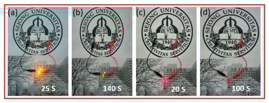 To investigate the capability of the ASSSC device, a pair of charged devices were assembled in series and employed for better explanation. At first, the successively connected pair of the ASSSC devices were charged for 30 s and then discharged by connecting to the diverse-colored light-emitting diodes (LEDs) as loads, and were illuminated for around 140 and 100 s, respectively (Figure 9a–d). Note that LEDs require a specific voltage for operation; for example, the yellow LED requires 2.0 V and the red one requires 1.8 V. The initial glorious glow of the LEDs indicates a high-power demonstration and a lengthy discharge affirming the superior energy density of the ASSSC device. Thus, the ASSSC device highlights a good electrical energy-storing capability.