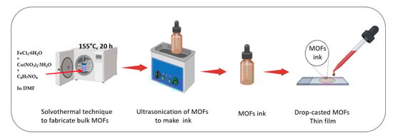 In this work, solvothermally synthesized MOF inks were applied through drop-cast on an NF substrate to form mechanically resilient MOF thin film electrodes. Initially, the solvothermal reaction was used to produce the bulk MOF powder followed by ultrasonic treatment in DMF solvent.