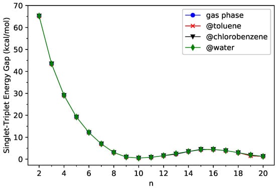 where and are the spin-unrestricted TAO-PCM free energies (given by Equation (1)) associated with the lowest singlet and lowest triplet states, respectively, of n-acene in the continuum solvent. For comparison purposes, we additionally report the results of the corresponding KS-PCM (i.e., KS-LDA/C-PCM). As presented in Figure 2 and Figure 3 (see Tables S1 and S2 in the SI (Supplementary Information) for additional information), the ST gaps of n-acenes in three different solvents (toluene, chlorobenzene, and water) are essentially the same as those of n-acenes in the gas phase, indicating that the solvation effects play insignificant roles here. In addition, for all the cases investigated, n-acenes in different media possess singlet ground states. As molecules with MR character are commonly characterized by small ST gaps, similar to the gas-phase situations [37,38,39,43,44,45], in the three solvents, the larger n-acenes, which have smaller ST gaps, are expected to have more significant MR character than the smaller n-acenes.