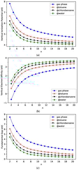 Because of the monotonically decreasing nature of and the monotonically increasing nature of with an increasing n-acene size, unsurprisingly, for each solvent studied, the decreases in a monotonic manner with an increasing n. Moreover, for each n-acene studied, the decreases as the solvent dielectric constant increases. Consequently, the of n-acene is the largest in the gas phase () and is the smallest in water ().
