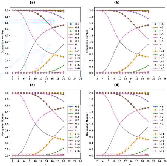 Occupation numbers of active TAO-orbitals for the ground state of n-acene in (a) the gas phase and in three different solvents: (b) toluene, (c) chlorobenzene, and (d) water, obtained from spin-restricted TAO-PCM (i.e., TAO-LDA/C-PCM). For brevity, the H/L is used for the HOMO/LUMO.