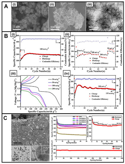 (A) (i,ii) SEM images and (iii) TEM image of the hierarchical CuS nanosheets, produced via a ‘microwave heating’ method [37]. (B) (i) Capacity and CE of the CuS electrode at 100 mA g−1, (ii) rate capabilities of the CuS electrode with various current densities from 20 to 200 mA g−1, (iii) discharge and charge profiles at different current densities, and (iv) long-term cycling of the CuS electrode at 200 mA g−1 [37]. (C) FESEM and TEM images of CuS-rGO-2 at low and high magnifications and cycling performance of CuS, CuS-rGO-1, CuS-rGO-2, CuS-rGO-3, and rGO at a current density of 100 mA g−1; rate performance of CuS-rGO-2; and long cycling performance of CuS-RGO-2 at 1 A g−1 [41]. Panels (A,B) have been adapted with permission from ref. [37]. Copyright 2019 American Chemical Society. Panel (C) has been adapted with permission from ref. [41]. Copyright 2017 American Chemical Society.