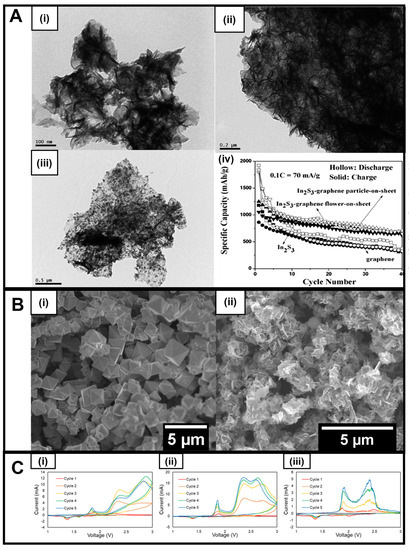 Additionally, while mainly utilized in the context of photocatalysts and solar cells, In2S3 is attractive for battery applications, because it possesses not only a reasonably sizeable theoretical capacity of 713 mA h g−1 but also a desirable spinel crystal structure similar to that of high-performing materials such as magnetite and lithium titanate [72]. Not surprisingly, In2S3 nanoflowers and nanoparticles have been dispersed onto graphene nanosheets to form a sandwich-like hierarchical structure for LIB anodes [44]. As a starting point, In2S3 nanoflowers were first optimized by controlling parameters, such as temperature and time to construct structures measuring several hundred nanometers in diameter at 140 °C for 20 min upon reaction of indium chloride and thioacetamide precursor reagents with CTAB as the surfactant in water (Figure 2A(i)).