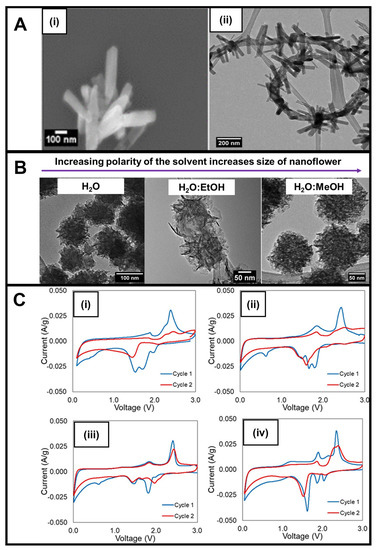 In our lab, whereas 1D nanorods were created using vanadyl acetylacetonate as the vanadium precursor and thioacetamide as the sulfur precursor within a DMF solvent after 10 min of reaction time (Figure 5A(i)), the corresponding 3D nanoflowers could be synthesized by replacing the original vanadium precursor with sodium orthovanadate and substituting DMF with aqueous solvents ranging from a water/ethanol or a pure methanol mixture. In particular, VS4 nanoflowers measuring from 100 to 200 nm in diameter were constructed by varying the solvent composition from water onwards to a water/ethanol mixture and ultimately to a water/methanol combination (Figure 5B); increasing solvent polarity led to a corresponding increase in the size of the resulting VS4 nanoflowers. Our modification to the microwave synthesis protocol was noteworthy in that the process did not require the use of a conductive carbon substrate and ran at shorter reaction times in a neutral environment while still demonstrating the capability of exerting proper compositional and morphological control [83].